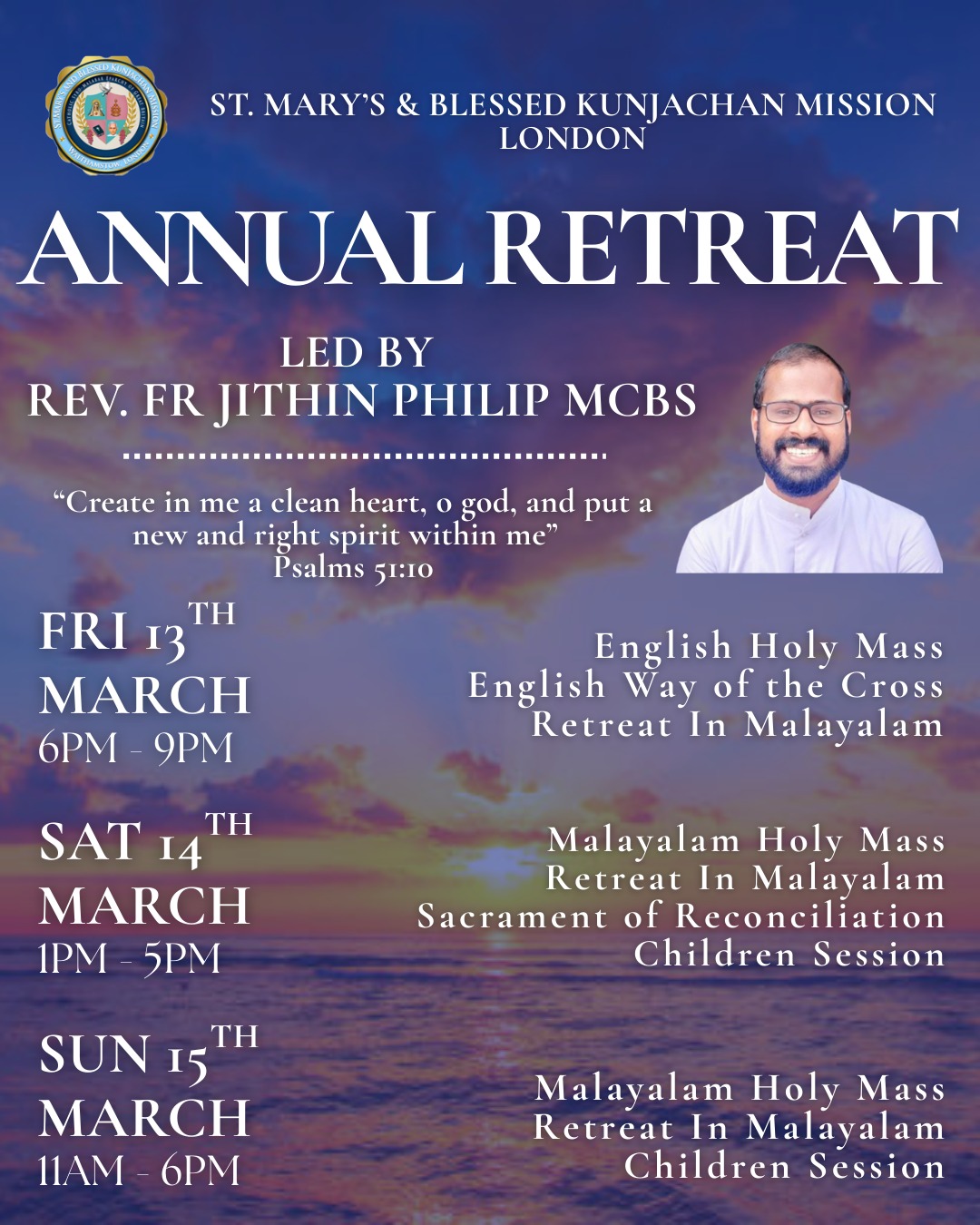 Our annual retreat will be held on the 13th, 14th, and 15th of March 2026, and will be led by Rev. Fr. Jithin Philip MCBS. The details are as follows: